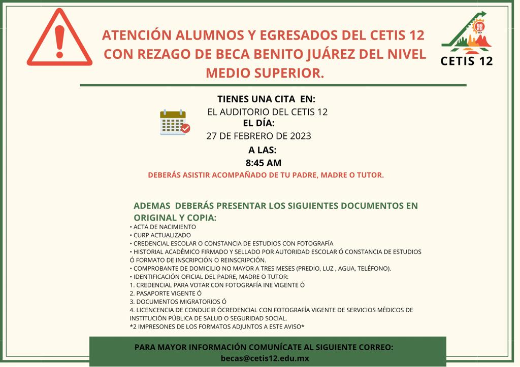 ATENCIÓN ALUMNOS Y EGRESADOS DEL CETIS 12 CON REZAGO DE BECA BENITO JUÁREZ