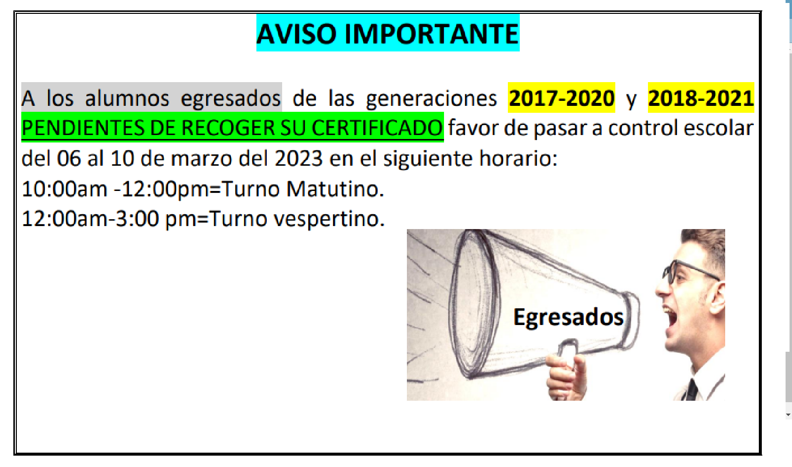 A los alumnos egresados de las generaciones 2017-2020 y 2018-2021 PENDIENTES DE RECOGER SU CERTIFICADO favor de pasar a control escolar del 06 al 10 de marzo del 2023 en el siguiente horario: