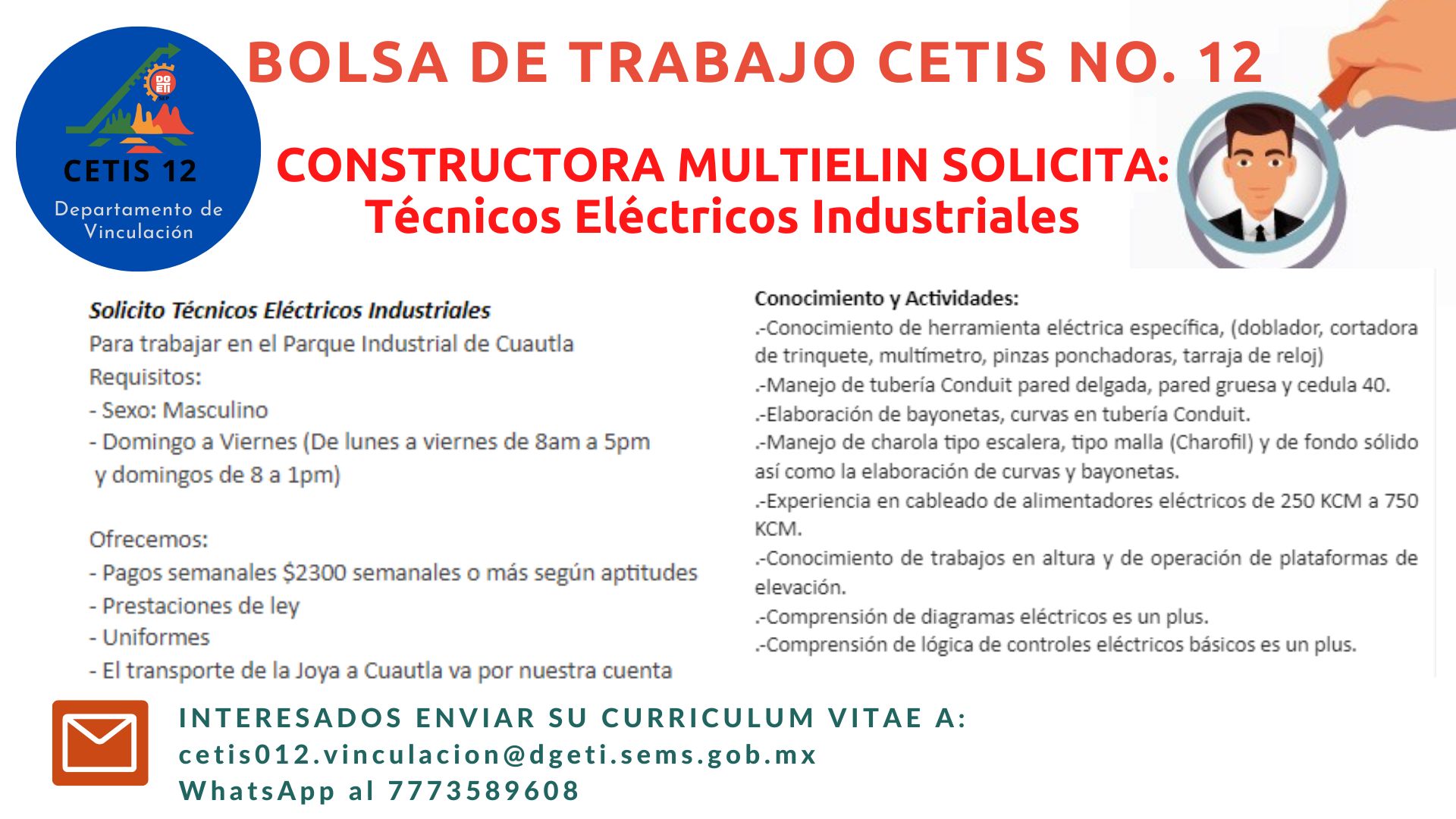 FAVOR DE ENVIAR SU CURRICULUM A: cetis012.vinculacion@dgeti.sems.gob.mx o al WhatsApp 7773589608