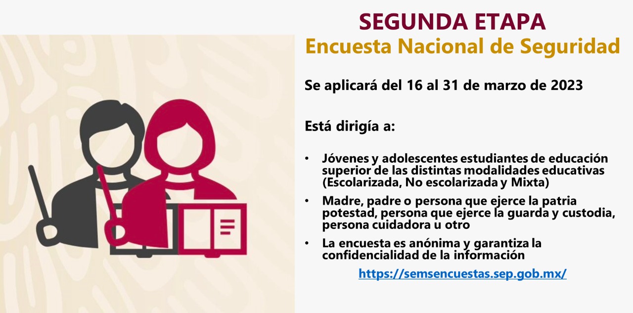 Buena tarde estimados estudiante, por este medio se les solicita de la manera más atenta ingresar a la liga para la aplicación de la Encuesta Nacional de Seguridad se les informa que ya está disponible la segunda etapa, en la cual participan estudiantes y madres, padres o tutores, misma que puedan contestarla a través de la siguiente liga https://semsencuestas.sep.gob.mx/