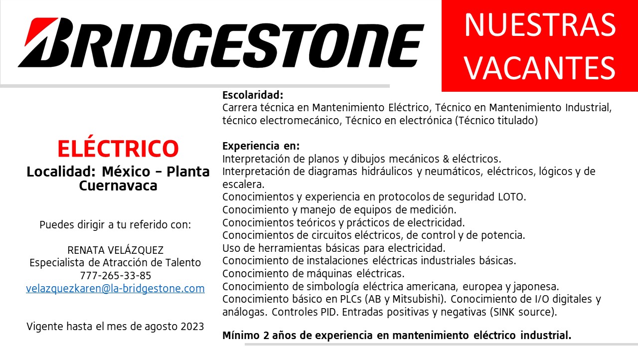 La Empresa Bridgestone Solicita TÉCNICO EN ELÉCTRICO, LUBRICADOR E INSTRUMENTISTA: