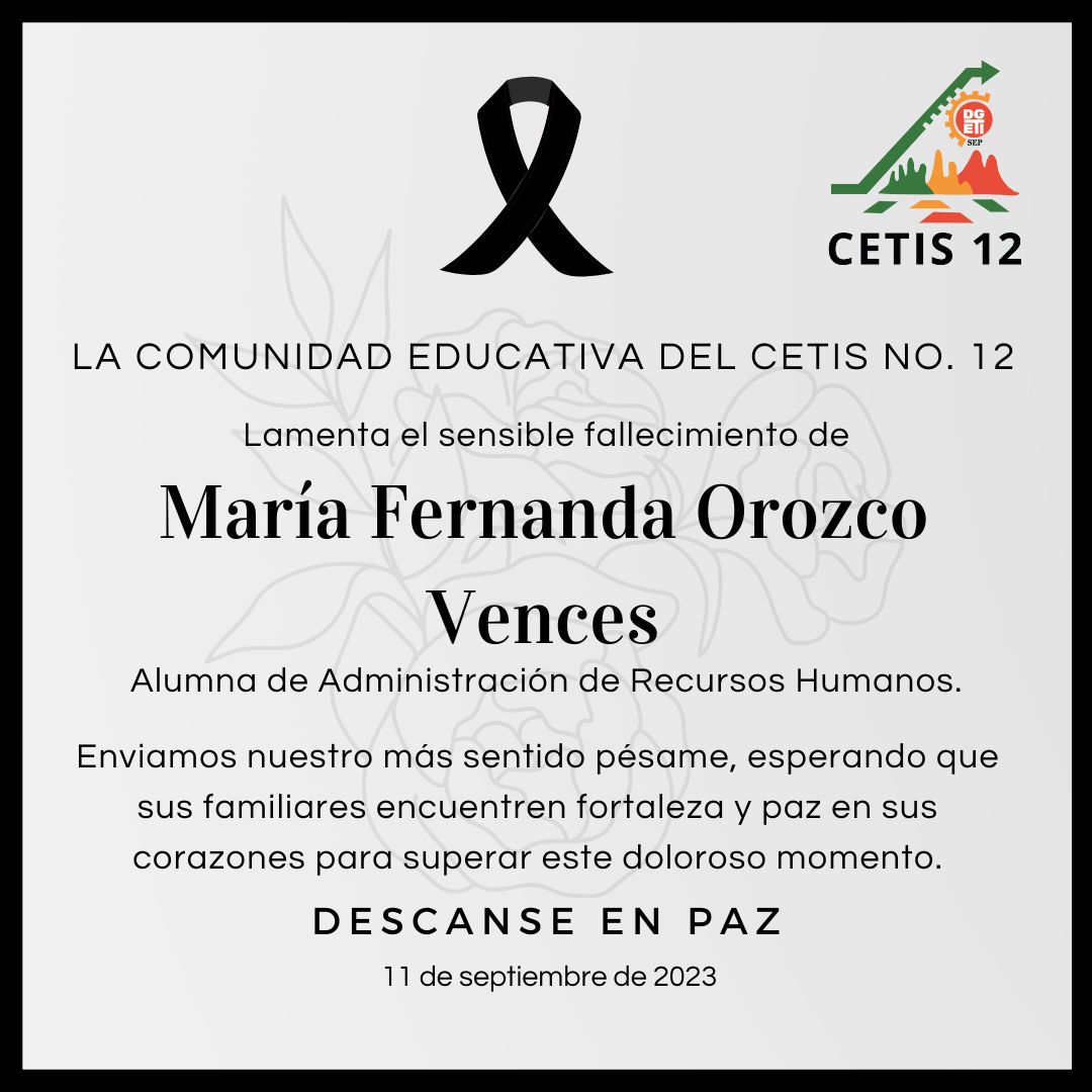 La comunidad del CETis No. 12 lamenta el sensible fallecimiento la alumna María Fernanda Orozco Vences, nuestro más sentido pésame a su familiares y amigos.