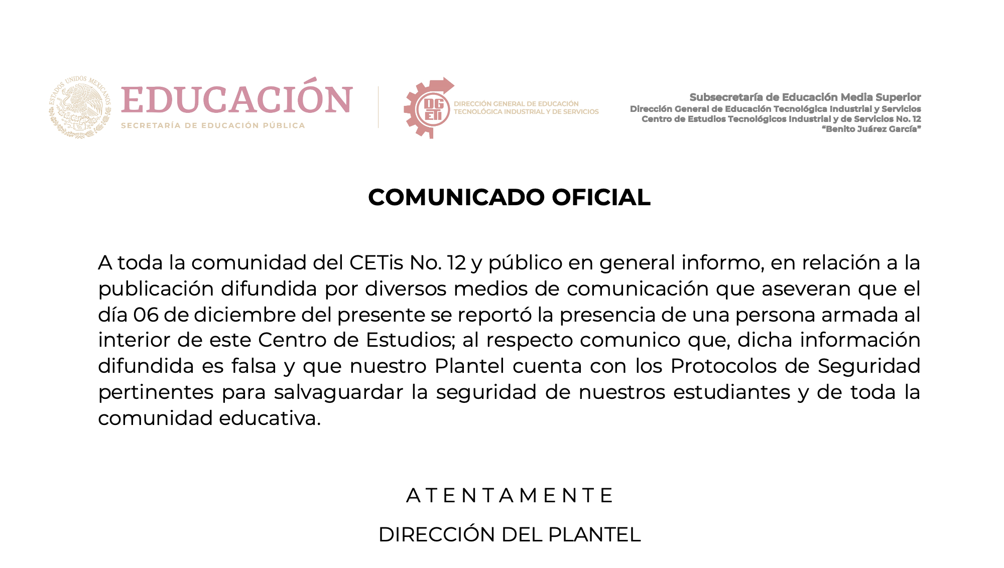 A toda la comunidad del CETis No. 12 y público en general informo, en relación a la publicación difundida por diversos medios de comunicación que aseveran que el día 06 de diciembre del presente se reportó la presencia de una persona armada al interior de este Centro de Estudios; al respecto comunico que, dicha información difundida es falsa y que nuestro Plantel cuenta con los Protocolos de Seguridad pertinentes para salvaguardar la seguridad de nuestros estudiantes y de toda la comunidad educativa.