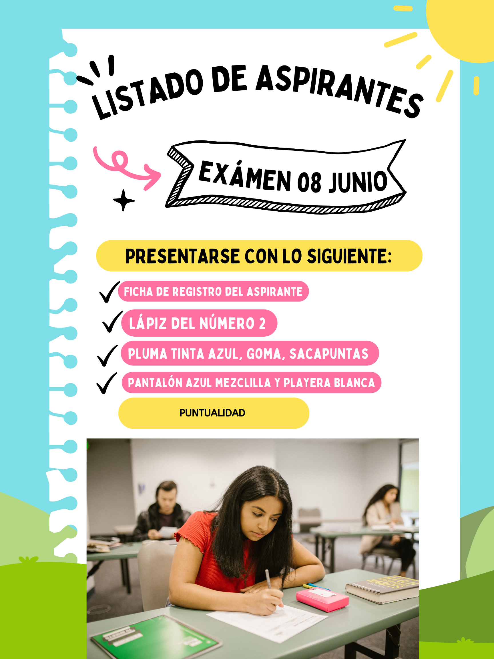 Buen día, por este medio se les da a conocer los listados de los alumnos que presentarán examen de admisión el día sábado 08 de junio del presente año, favor de descargar la lista y ubicar tu nombre y tu aula, recuerda ser puntual 7:00 am.