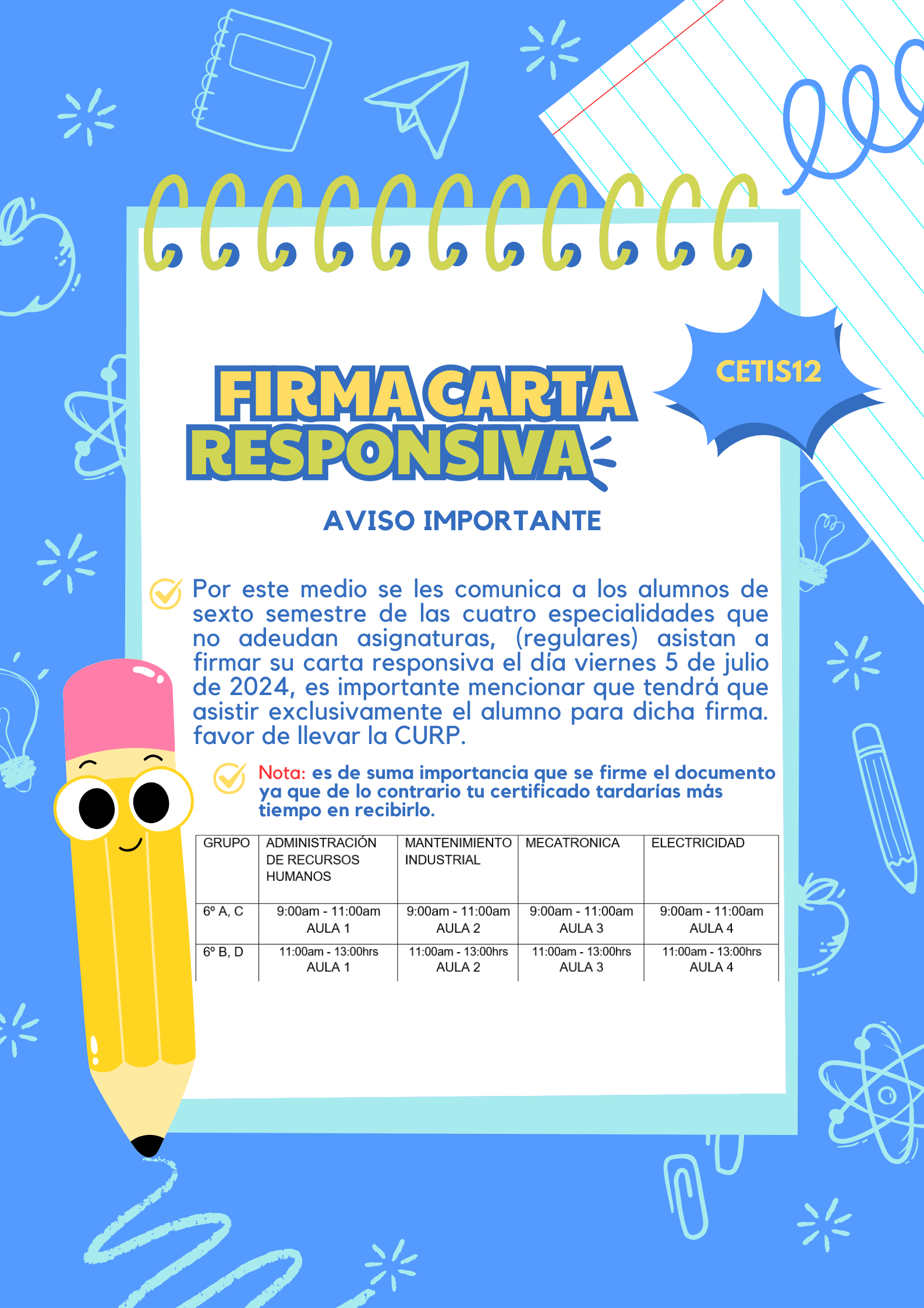 Por este medio se les comunica a los alumnos de sexto semestre de las cuatro especialidades que no adeudan asignaturas, (regulares) asistan a firmar su carta responsiva el día viernes 5 de julio de 2024, es importante mencionar que tendrá que asistir exclusivamente el alumno para dicha firma. favor de llevar la CURP.