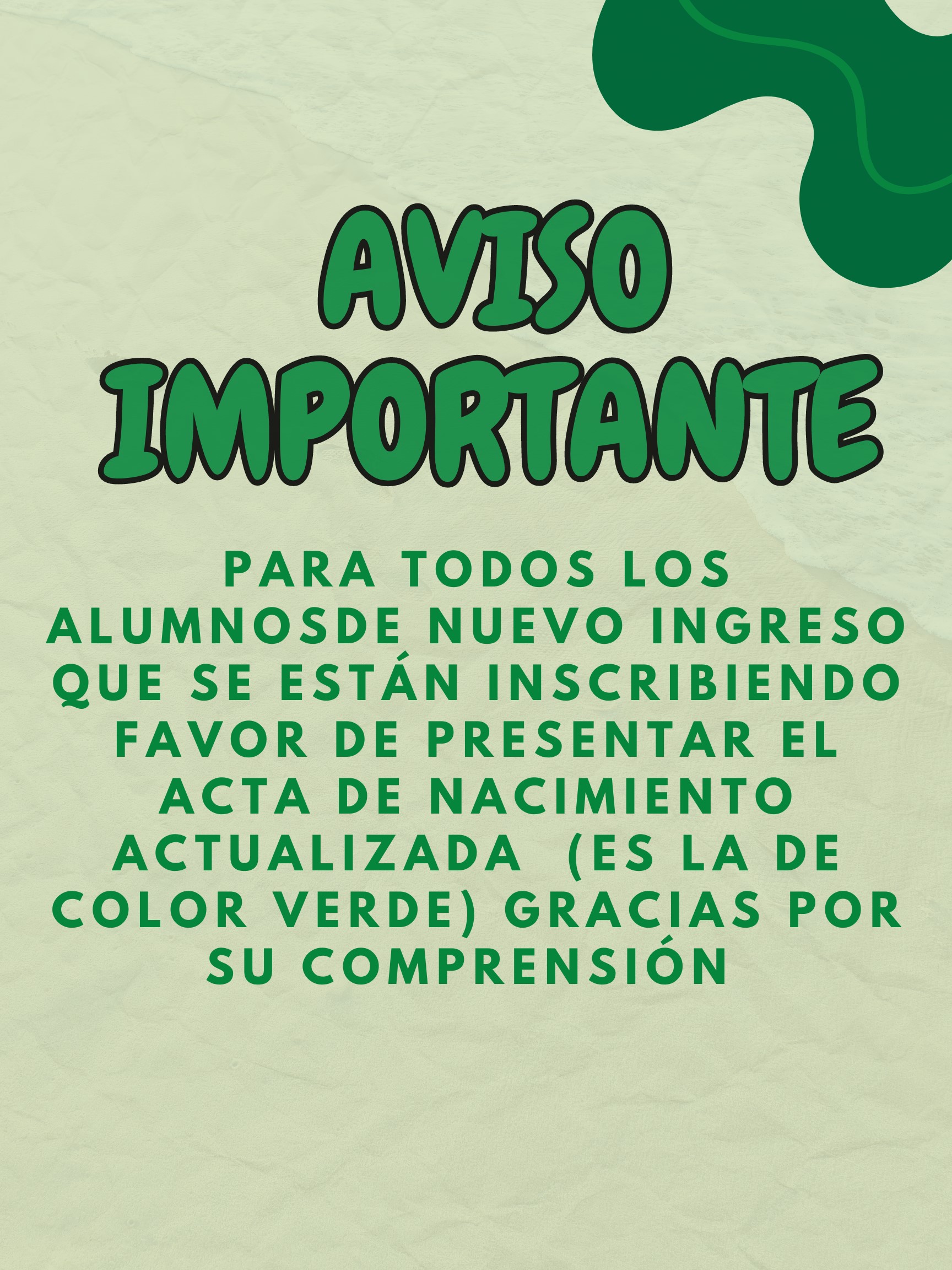Buena tarde estimados padres de familia, por este medio se les informa que para realizar tu tramite es importante entregar el acta de nacimiento actualizada ( la de color verde)