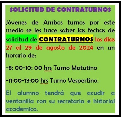 Jóvenes de Ambos turnos por este medio se les hace saber las fechas de solicitud de CONTRATURNOS los días 27 al 29 de agosto de 2024 en un horario de: