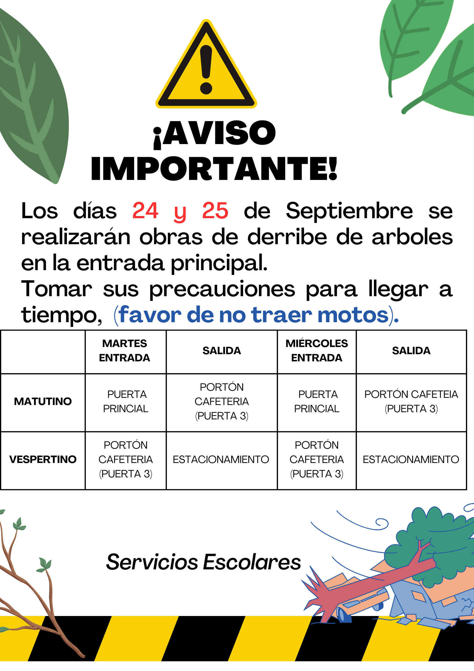 Por este medio se les informa que los días martes 24 y miércoles 25 de Septiembre se realizarán obras de derribe de arboles en la entrada principal. Tomar sus precauciones para llegar a tiempo, (favor de no traer motos).