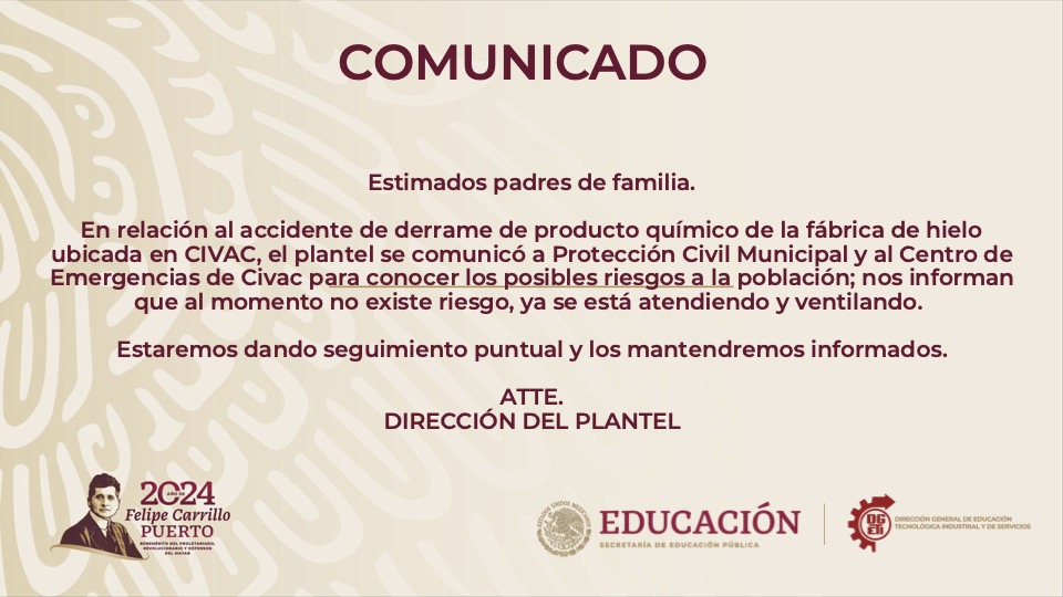 En relación al accidente de derrame de producto químico de la fábrica de hielo ubicada en CIVAC, el plantel se comunicó a Protección Civil Municipal y al Centro de Emergencias de Civac para conocer los posibles riesgos a la población; nos informan que al momento no existe riesgo, ya se está atendiendo y ventilando.