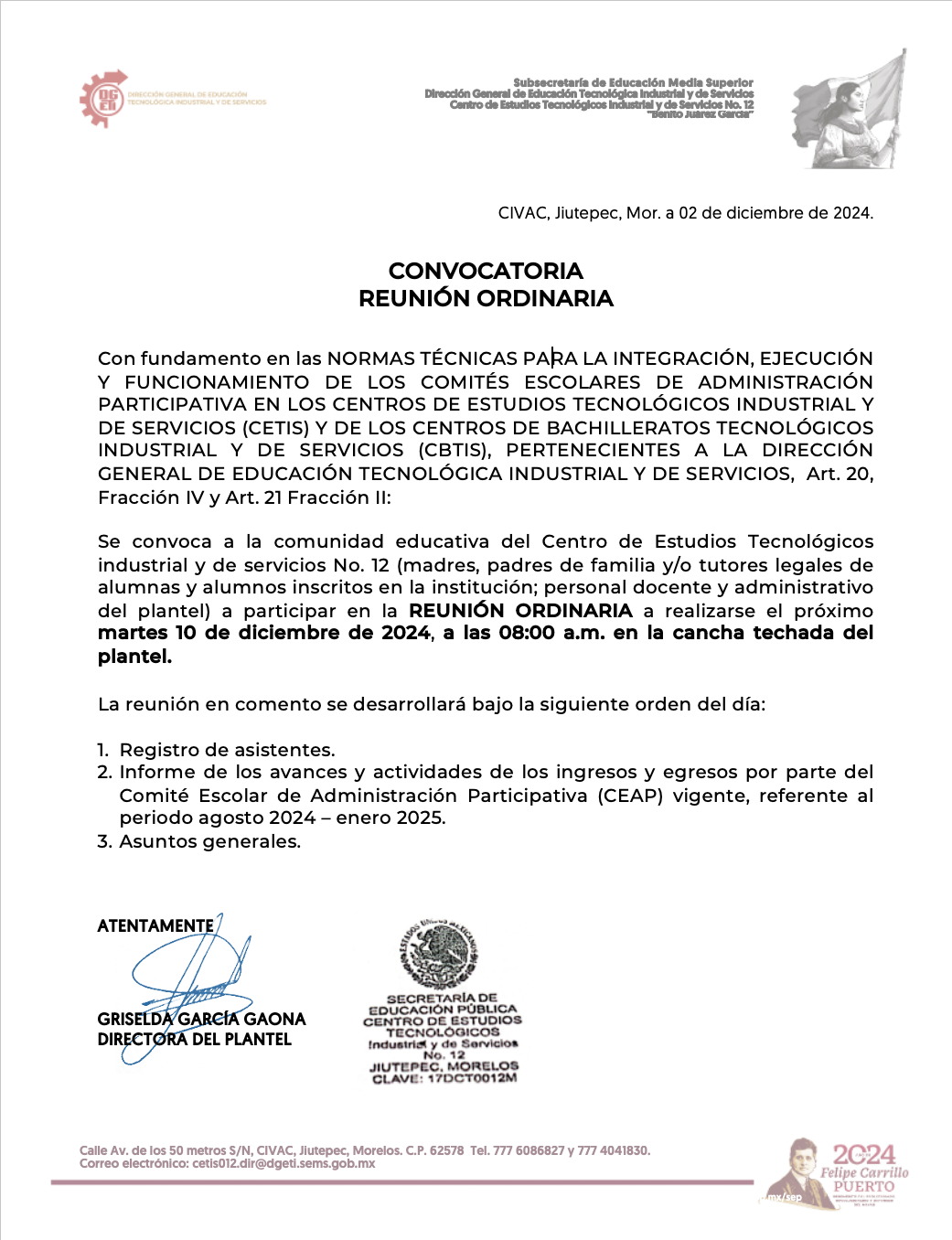 Se convoca a la comunidad educativa del Centro de Estudios Tecnológicos industrial y de servicios No. 12 (madres, padres de familia y/o tutores legales de alumnas y alumnos inscritos en la institución; personal docente y administrativo del plantel) a participar en la REUNIÓN ORDINARIA a realizarse el próximo martes 10 de diciembre de 2024, a las 08:00 a.m. en la cancha techada del plantel.