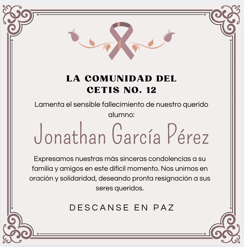 La comunidad del CETis No. 12 lamenta el sensible fallecimiento del alumno Jonathan García Pérez, nuestro más sentido pésame a su familiares y amigos.