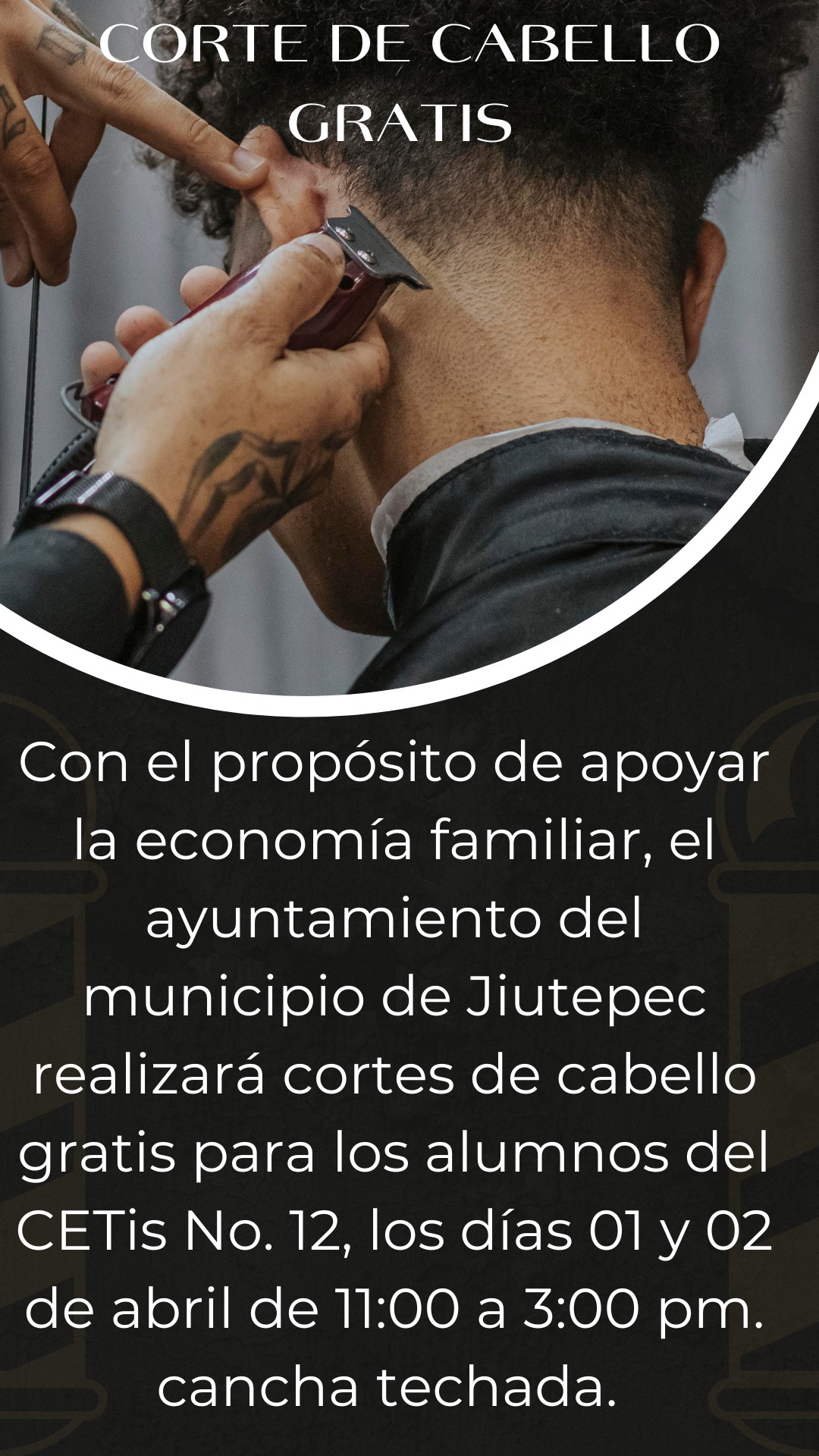 Con el propósito de apoyar la economía familiar, el ayuntamiento del municipio de Jiutepec realizará cortes de cabello gratis para los alumnos del CETis No. 12, los días 01 y 02 de abril de 11:00 a 3:00 pm.