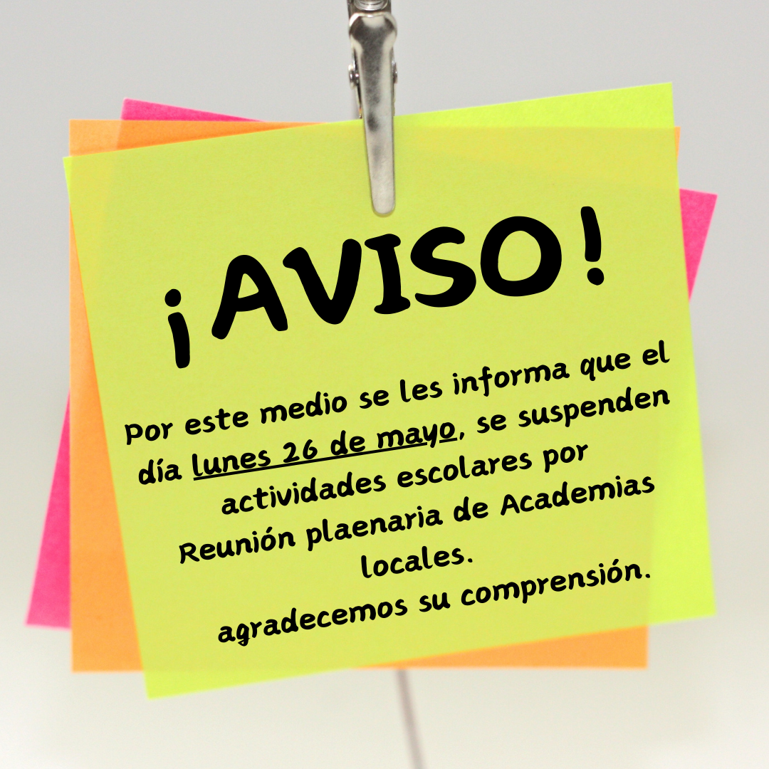 Por este medio se les comunica a la comunidad estudiantil que el día 26 de mayo, los docentes estarán trabajando de forma colegiada con sus academias. Por tal motivo, las clases serán suspendidas. Reanudamos actividades normales el martes 27 de mayo.