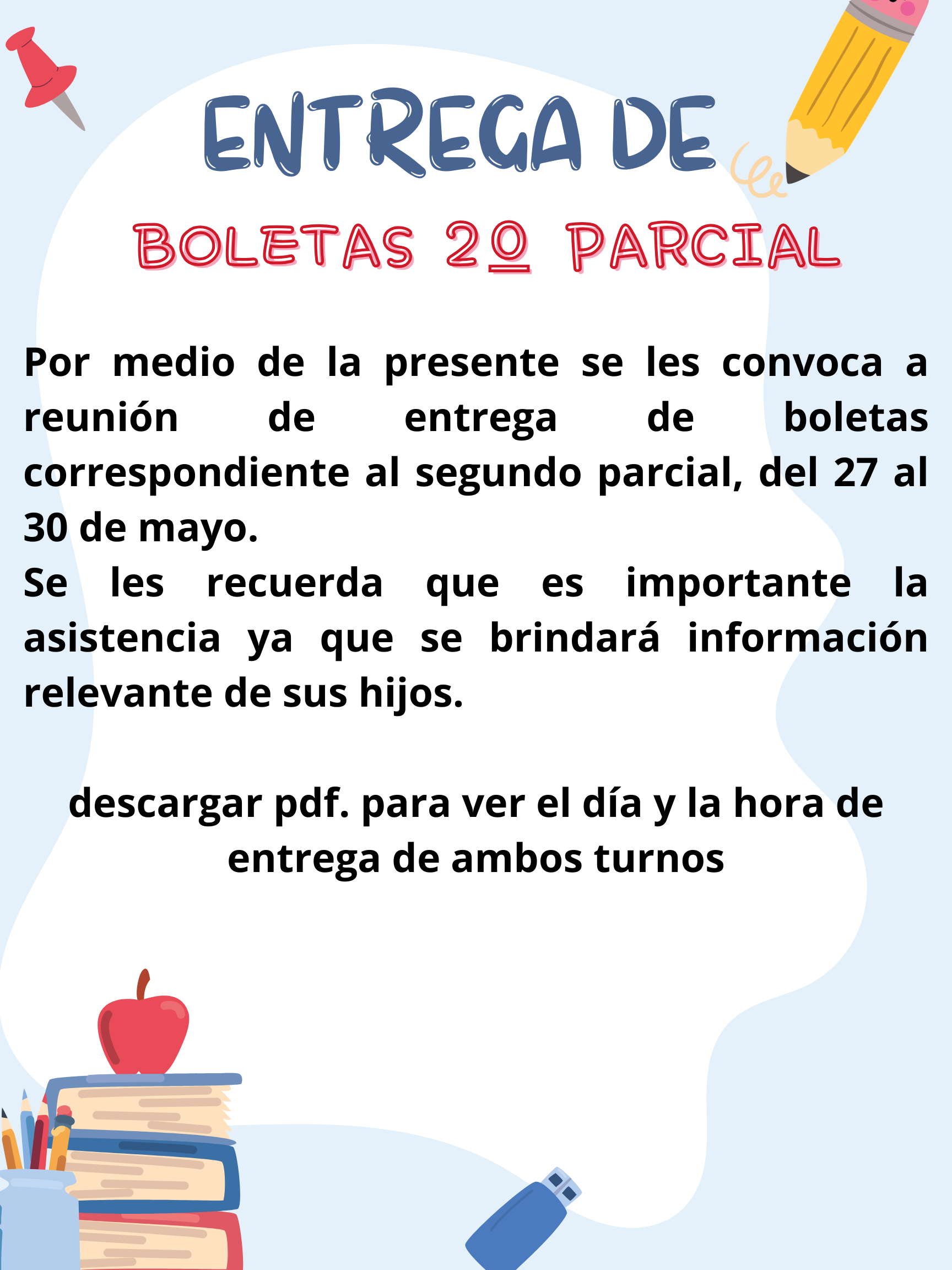 Por medio de la presente se les convoca a reunión de entrega de boletas correspondiente al segundo parcial, del 27 al 30 de mayo.