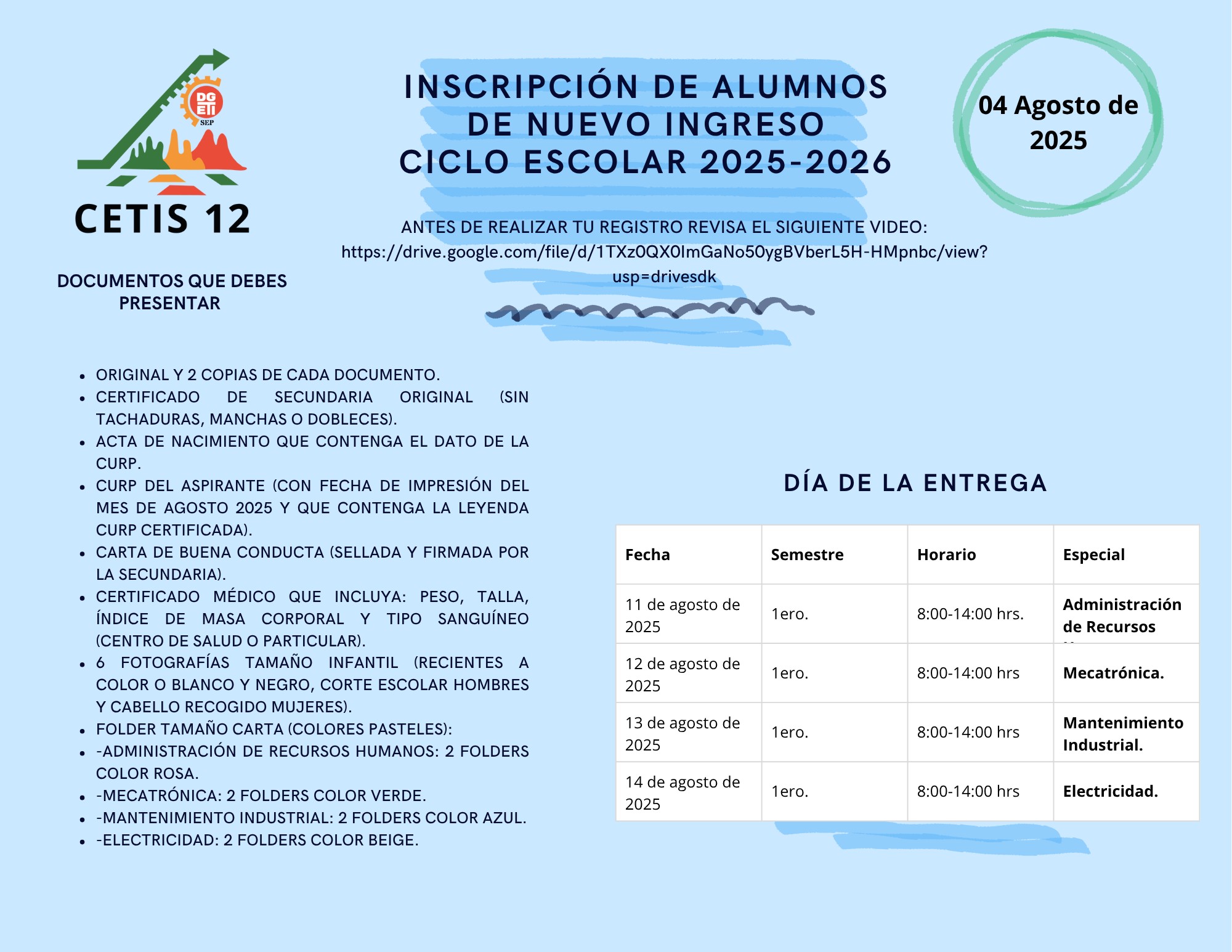 • FORMATOS DE PROTOCOLOS Y ACUERDO DE CONVIVENCIA FIRMADOS POR EL PADRE, MADRE O TUTOR, AGREGANDO COPIA LEGIBLE DE SU INE (LLENAR Y FIRMAR CON TINTA AZUL), LOS CUALES ESTARÁN DISPONIBLES EN LA PAGINA www.cetis12.edu.mx A PARTIR DEL MES DE AGOSTO.