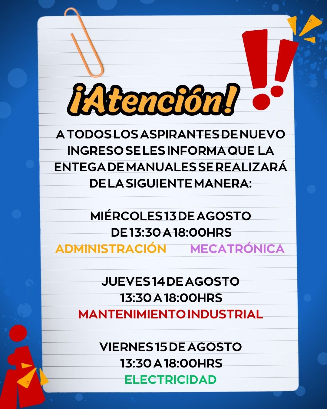 A TODOS LOS ASPIRANTES DE NUEVO INGRESO SE LES INFORMA QUE LA ENTEGA DE MANUALES SE REALIZARÁ DE LA SIGUIENTE MANERA: