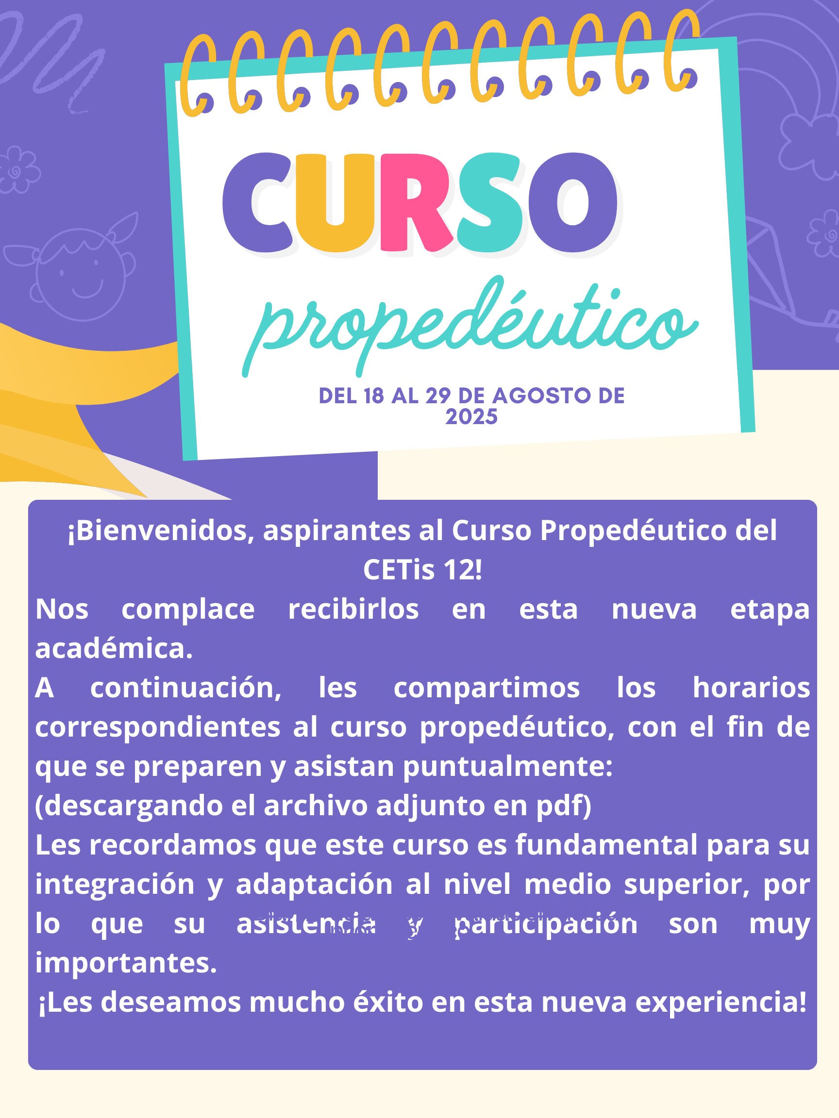Nos complace recibirlos en esta nueva etapa académica. A continuación, les compartimos los horarios correspondientes al curso propedéutico, con el fin de que se preparen y asistan puntualmente: