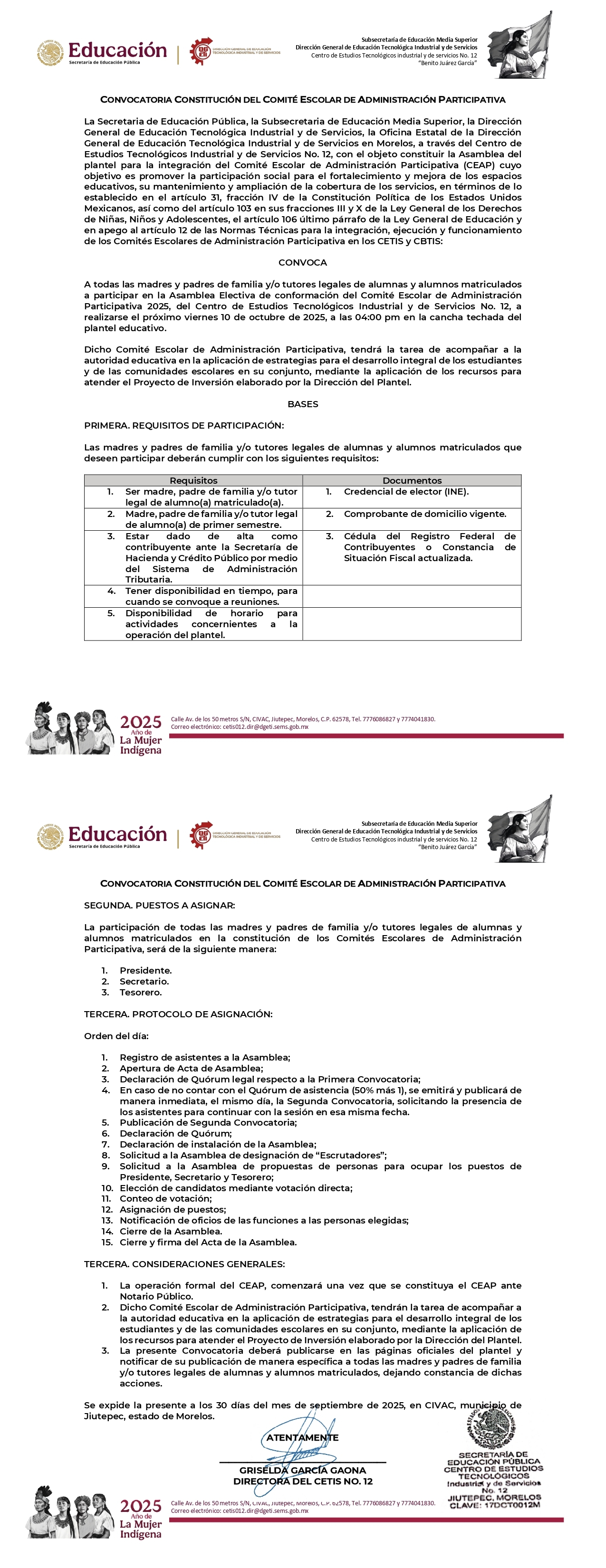 El CETis No. 12 convoca a la comunidad escolar a participar en la Asamblea Electiva para la conformación del Comité Escolar de Administración Participativa (CEAP) 2025, que se llevará a cabo el viernes 10 de octubre de 2025 a las 4:00 p.m. en la cancha techada del plantel.