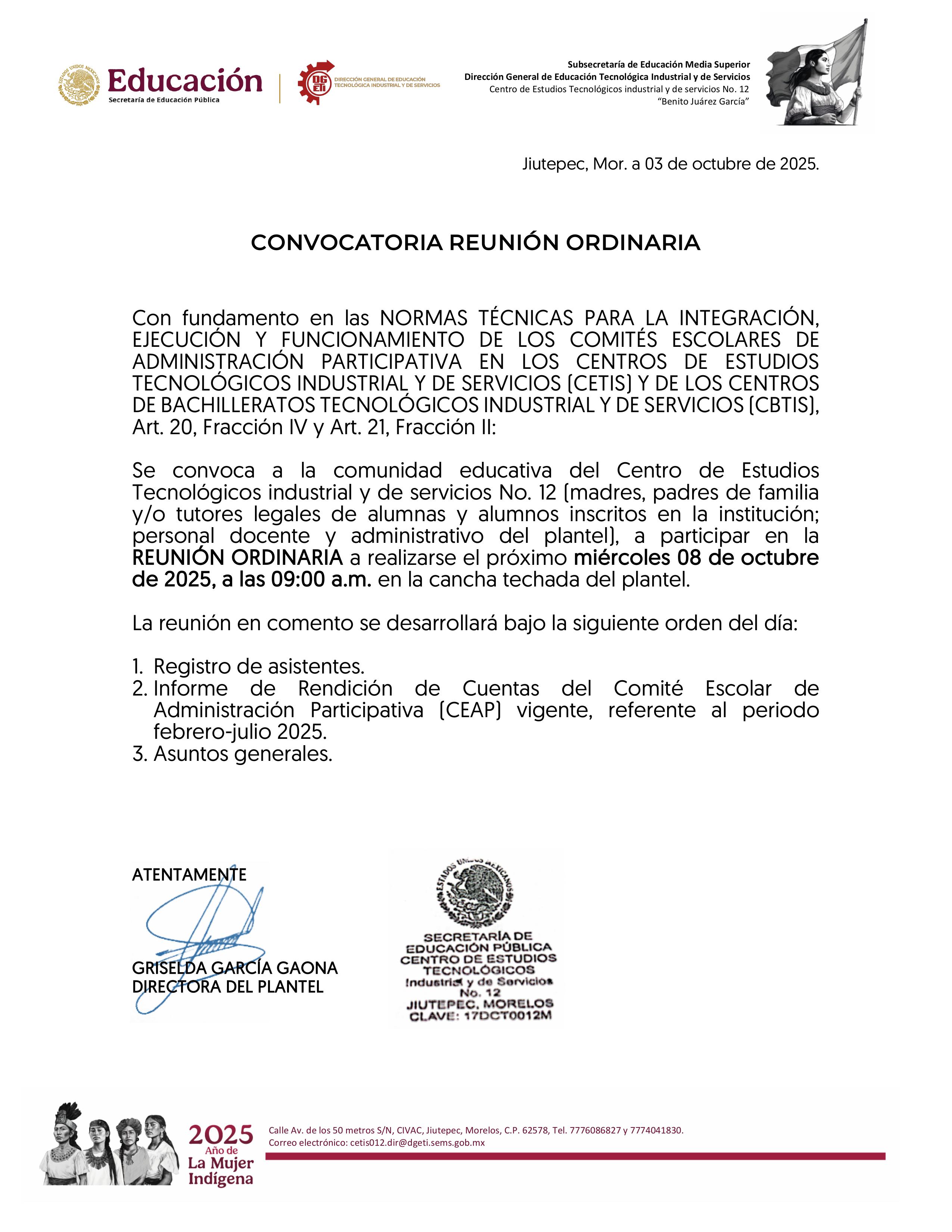 Se convoca a la comunidad educativa del Centro de Estudios Tecnológicos industrial y de servicios No. 12 (madres, padres de familia y/o tutores legales de alumnas y alumnos inscritos en la institución; personal docente y administrativo del plantel), a participar en la REUNIÓN ORDINARIA a realizarse el próximo miércoles 08 de octubre de 2025, a las 09:00 a.m. en la cancha techada del plantel.